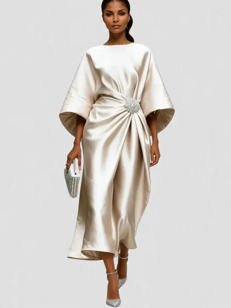 • Type: Satin-Effect Draped Midi Dress with Brooch Detail